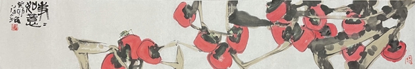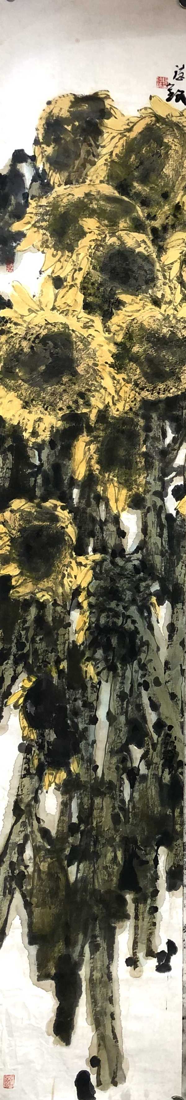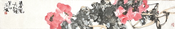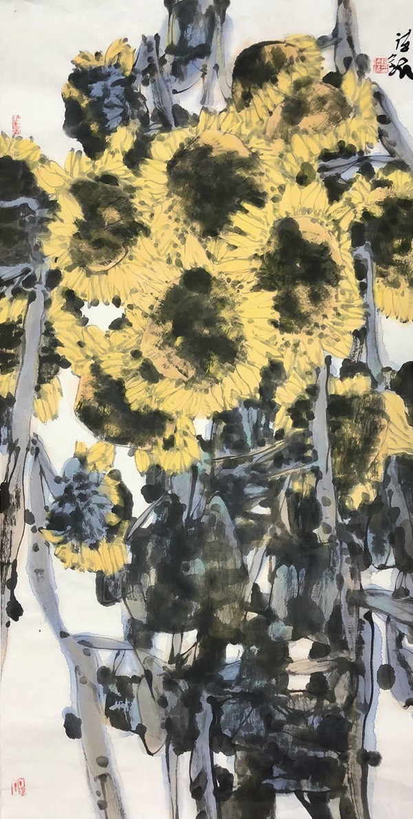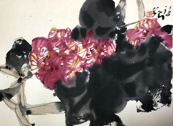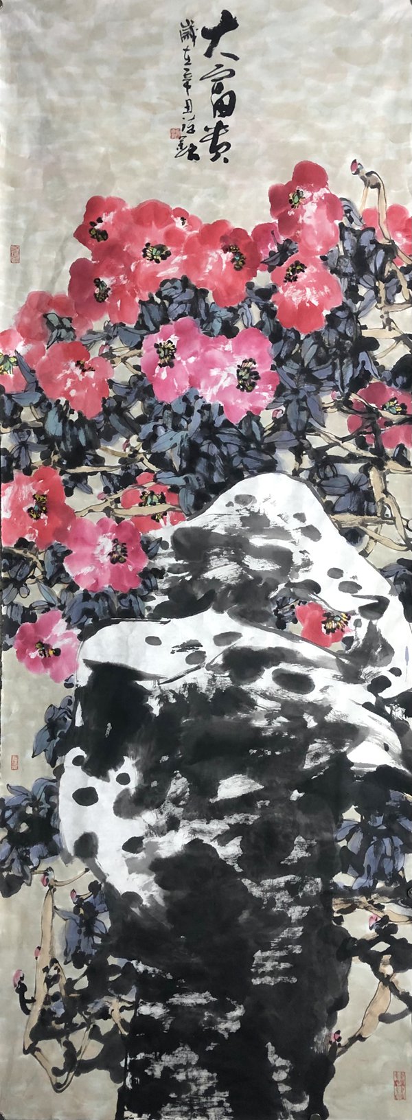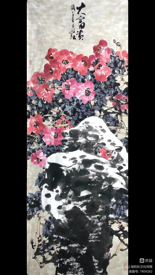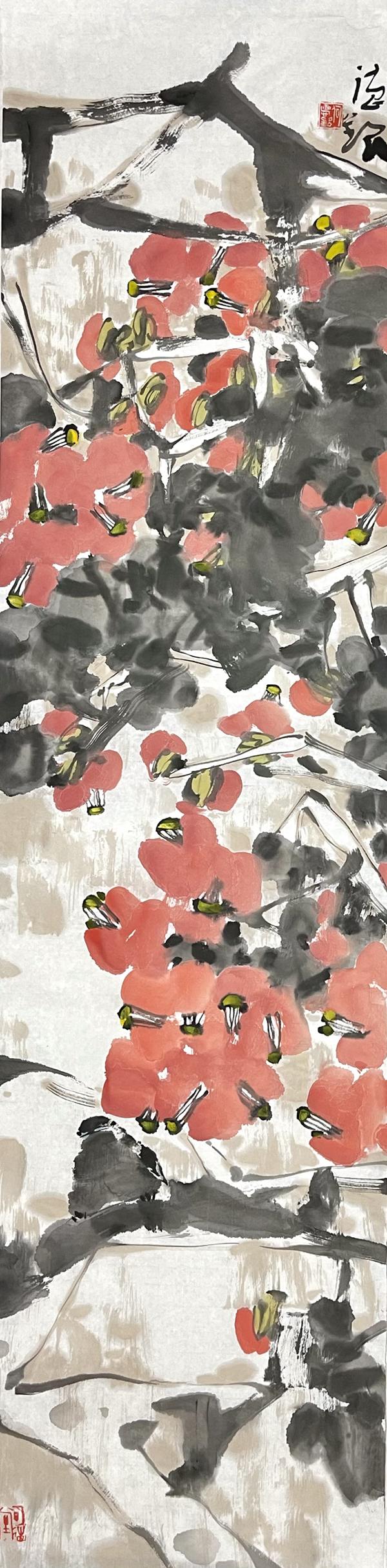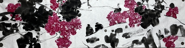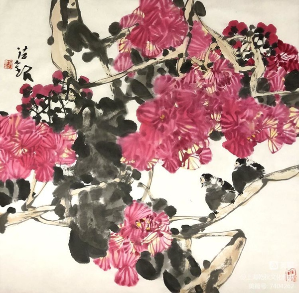 何德明先生创作写意花鸟画主要用色彩结合水墨及泼彩,很少用单纯水墨。这一点与明清文人画有所区别,继承了吴昌硕、齐白石的路线。但他又努力与吴、齐拉开距离,从西画色彩法中吸收一些因素,使色彩更鲜亮、丰富和有视觉效果。
