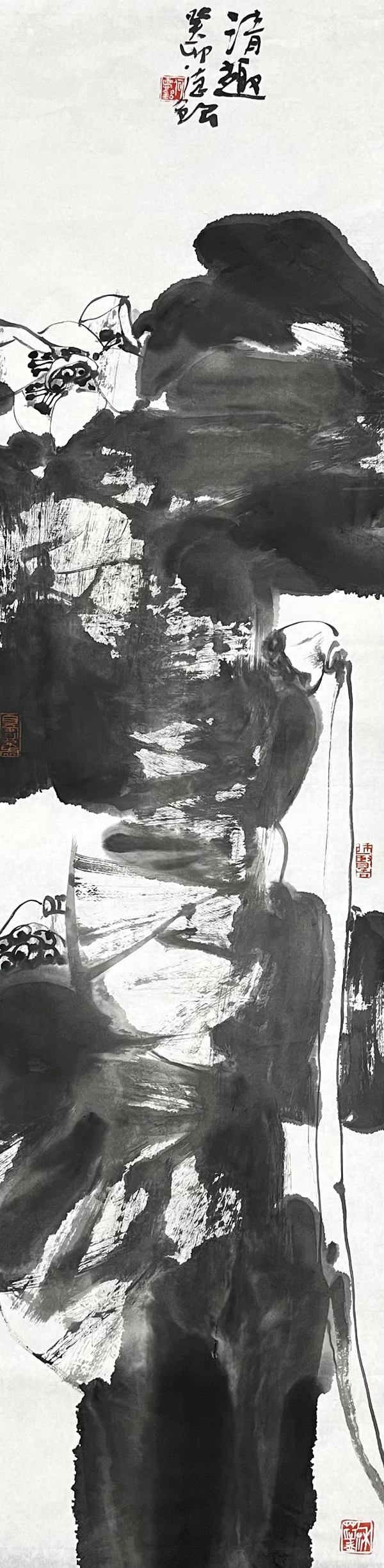 何德明先生尤喜用纯墨色表现内心的感受,笔墨益趋简约。画花难,画鸟更难。鸟的造型神态更直接地反映着他内心的声音,或欢乐,或忧伤,或浪漫,其本质为人之情感表现,而其结构、比例又必须合于常理。为传达鸟之神韵,他作了大量的写生,观察鸟的各种形态,积累了大量的素材。在创作中并不因循守旧。他的笔墨气象、画面意境均有较明显的个人面貌。