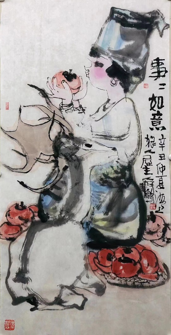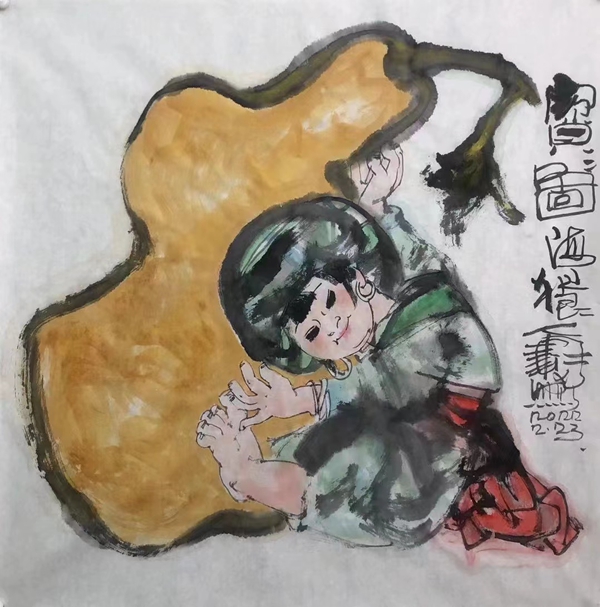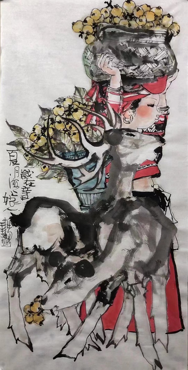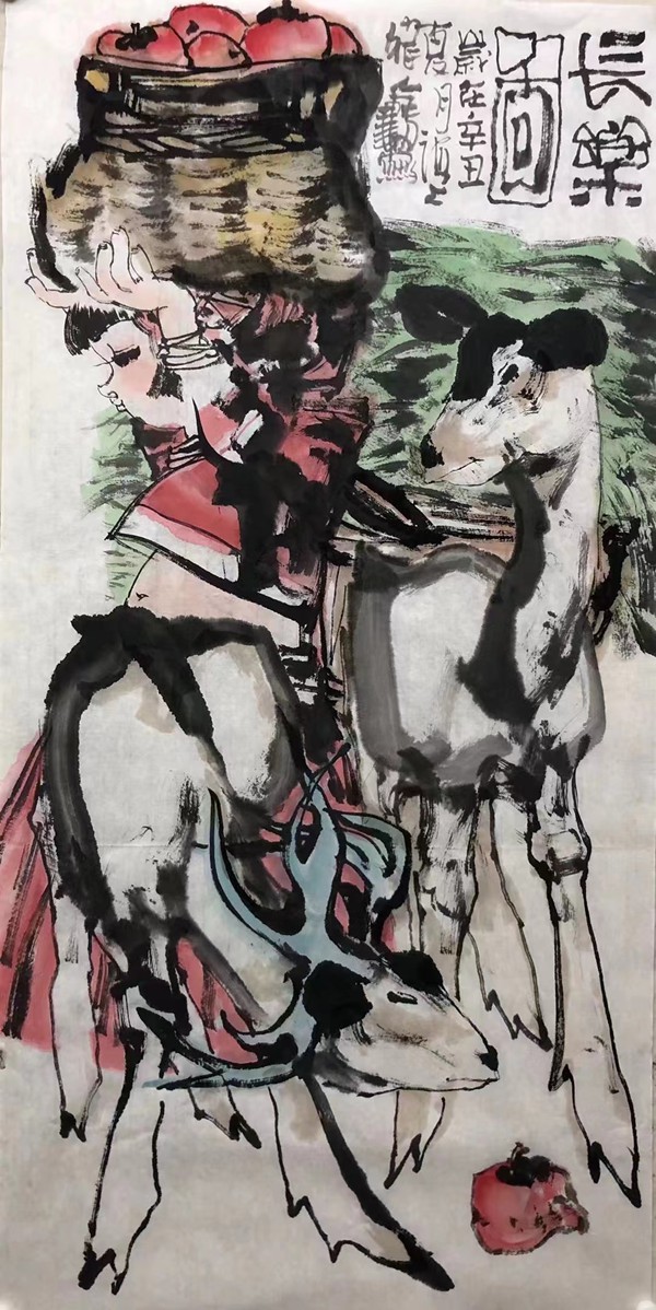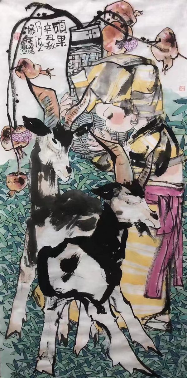 幸福的人物画既有前辈先贤的风格投射,也有完全独立的思考痕迹,作为个人爱好,他似乎比较喜欢程十发先生的造型风格,于是便有了幸福的借鉴与研习,有了幸福笔下的少女和牛、羊,类十发却非十发,是谓借得精髓,另劈溪径,从而顺利地进入了自由发挥的美妙境界,也得到了社会各界的广泛认同。