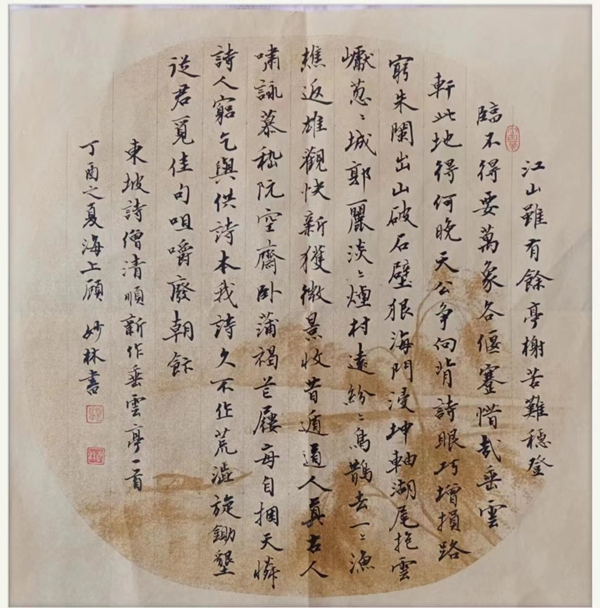 顾妙林,1949年生,上海市宝山人。上海市书法家协会会员,上海市书法家协会老年委员会宝山分会副会长,上海港书法家协会会长,上海东方书画院一级画师,上海行知书画院常务理事,上海梓雨书院副院长等。