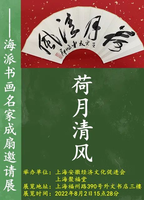 夏风如茗,八月桂香。在庆祝建军95周年和迎接党的二十大胜利召开之际,上海安徽经济文化促进会文化艺术专委会和上海聚福堂联袂举办《荷月清风.名家成扇展》。这是沪皖两地书画界的一件喜事,是发扬国粹,文化自信的一场艺术盛宴。