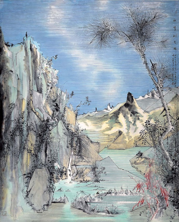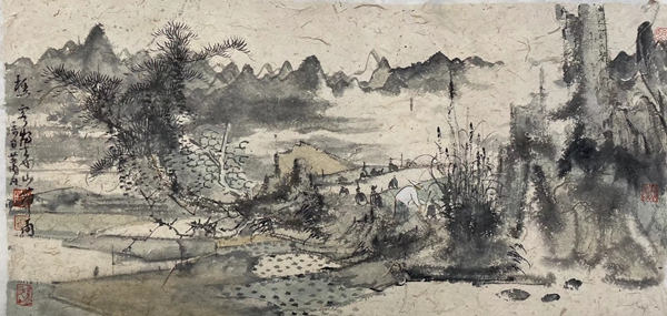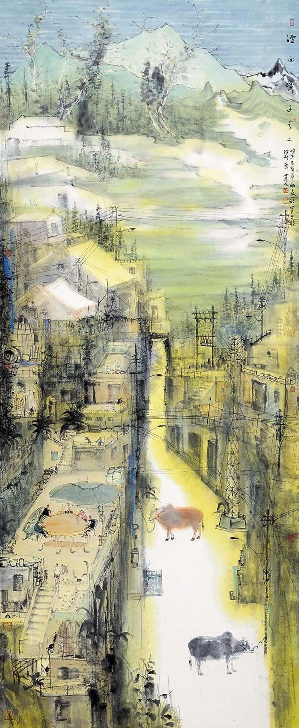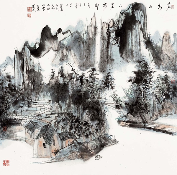而肖凡山水画的另一特点是往往有奇崛之构。滇地山高林茂,高低错落,枝乱藤蔓,于乱林中常有三几木楼,鸡犬相闻。目之所及,其景多溢出凡表。于是,肖凡的山水画构图,多视点奇凸,似俯瞰似平视,似散点似焦点,万物于心于眼,随意而成图画。故其意境也多于轻松随意处见奇崛,在常规中不落俗套,于奇特处时见凡心。