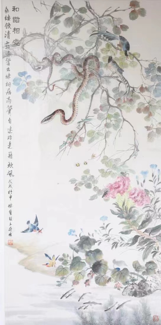 我注意到,蒋伟的十二生肖长中,每种动物背后都配有丰富的对应背景。画什么动物要搭配什么背景,这在中国传统绘画中是有严格讲究的,不能乱搭配,比如猛虎往往出没于山林,这就不但要求画家会画虎,还必须有一定的山水画基础。动物是人类的朋友,亦是科学艺术的灵感源来。中国文化深受中国古典哲学的影响,古人把十二生肖分为六组,两两相对,集中起来归于一点,就是每一对组合都是相互依赖、相互补充、相互渗透、相互完善的,用儒家思想解释,就是“君子和而不同”,这也正是儒家所倡导的人与人的相处之道。中国古代哲学很早就孕育出了“一张一驰”“对立统一”“阴阳互补”的辩证法思想,这也是我们中国文化之所以能够源远流长几千年的缘故。将伟在他的画中,将动物与山水、花鸟、草木集中展现在一起,并还原了动物与自然的关系,让人感到生命与自然的可爱和宝贵。他用画笔构建了一个和谐世界,世外桃源,从而表达出他对生态平衡意识的思考,强调了各类生命之间相互扶持的重要性,显示出辩证看待问题的思维模式,这是很不容易的。一幅十二生肖长卷对画家绘画功底的全面性和面外综合文化修养提出了很高的要求和挑战。