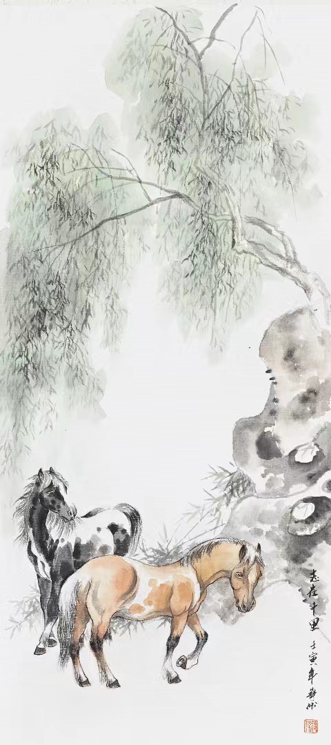 我们中国画讲究造型基础。基在南齐时,古人就提出了绘画六法,“应物象形”指的就是造型基础,它要求绘画作品首先要有生活基础,不能凭空杜撰。如果没有造型基础,三笔两笔按照一个套路画出来,那就不是造型基础。“应物象形”是需要智慧的,创作不是简单地客观记录,而是精简和提炼,这就需要画家对自然客观对象进行由表及里的认知和品味。人的思维都是客观形象投射到脑海中的反映,没有对自然形态的长期观察,笔下的形象就难有神韵,缺乏生动。至于如何在创作中融入对动物的感情,进行人性化处理,引起观众共鸣,这里面就可以看出画家的艺术手法的高低和人文情怀的深浅。“气韵生动”指的是画面效果,其背后映照着作者的人格修养、精神面貌,意识形态等,所谓“面如其人”,画品不俗,人亦不俗。画品不高,人无法高。