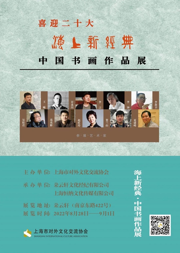 为迎接党的二十大的胜利召开, 8月28日至9月1日,由上海市对外文化交流协会主办的“喜迎二十大——海上新经典·中国书画作品展”在朵云轩(南京东路422号)举办。