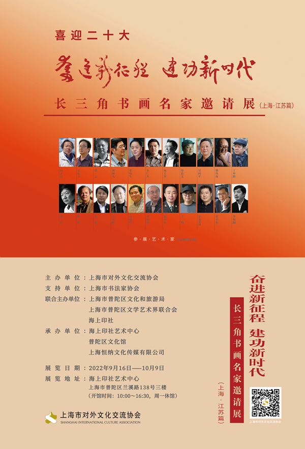 9月16日-10月9日,为迎接党的二十大胜利召开,积极响应推动长三角一体化发展国家战略,由上海市对外文化交流协会主办,上海市书法家协会支持,上海市普陀区文化和旅游局、上海市普陀区文学艺术界联合会、海上印社联合主办的“奋进新征程 建功新时代——长三角书画名家邀请展(上海-江苏)”在海上印社艺术中心(上海市兰溪路138号)举办。