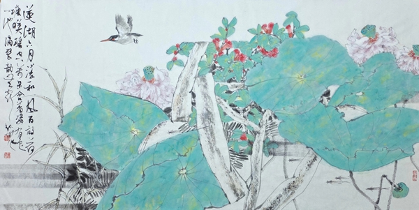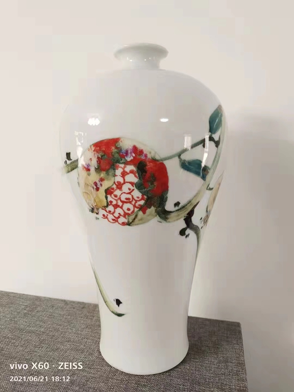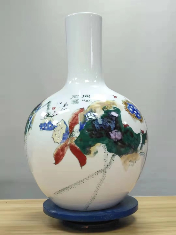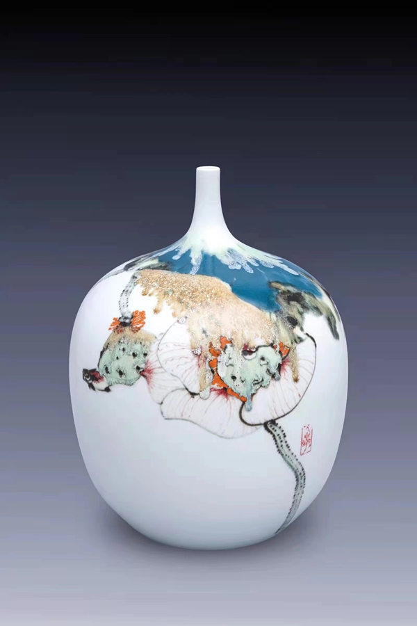 李新卫是中国美协会员,自幼喜欢美术,有着很高的艺术天赋,他的书法和国画得到名家刘小睛和陈琪的指点。他长期从事花鸟画创作,他笔下的花鸟,生机勃勃但又不事喧哗,设色淡雅明丽,有着一种“无意苦争春”,只是以自己芳华点缀我们生活的世界的低调和朴实,很像画家本人性格,低调沉稳,不求闻达。李新卫作为美协和书协的双料会员,坚持白天上班,晚上看书写字作画,这些年,他埋头秦古窑,执著于专研瓷画艺术,专心致志地在瓷坯上挥毫作画,在烈焰与瓷土1300度高温的对话中,让自己的艺术开出既有中国笔墨画韵味又有陶瓷画飞扬神采的鲜花和小鸟。中国陶瓷素来有着“白如玉,明如镜,薄如纸,声如磬”的典雅气质,新卫画瓷怀着对陶瓷的一片赤诚之心,反复琢磨纸上画和瓷上画的分野和不同。如果说,纸上画是艺术,那么瓷上画就是艺术和技术的结合。光有纸上画的艺术功力而不顾瓷器烧制的技术要求,就无法展现瓷画的妖娆美丽。特别是釉彩在熊熊烈焰催生的窑变时,你对火候的掌握,对釉彩融化后流动的边际预期控制,对色彩可能的全新的变化,新卫都反复实验、实践,以求出炉的瞬间达到最光彩照人过目不忘的视觉效果。釉里红的鲜艳,青花的素雅,绿叶的苍翠,大都在还原绘画色彩的同时还焕发出釉彩的特殊美感。新卫还遵循瓷画的规律特征,凸显中国画的笔墨线条千变万化的节奏韵律,从而超越了一般的技术层面,而有了相当的艺术含量。同时,因为立体的瓷器不同于平面的宣纸,在构图上,他随形就器,根据器形造型的不同,或扁或长,或方或圆,或大或小,惨淡经营画面,从而使器物上的图像与器物浑然一体,犹如雕塑,可以从各个立面加以欣赏,各有兴味。
