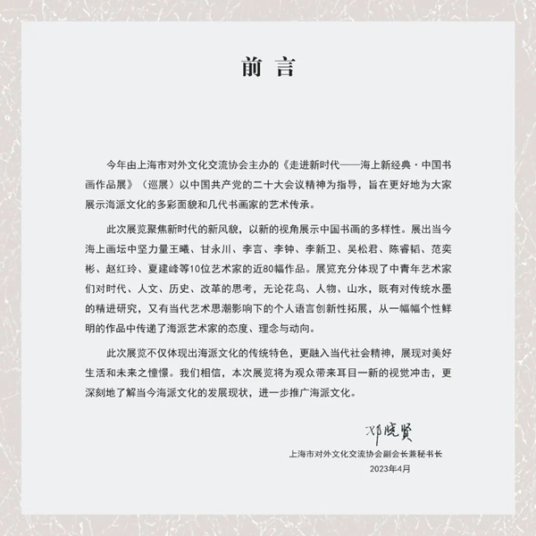 此次展览聚焦了新时代的新风貌,以新的视角展示中国书画的多样性。展出当今海上画坛中坚力量王曦、甘永川、李言、李钟、李新卫、吴松君、陈睿韬、范奕彬、赵红玲、夏建峰等10位艺术家的50余幅作品。