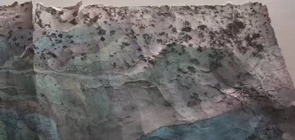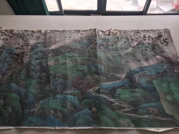 偌大的一幅大青绿山水因保管不善而受潮霉蚀的极其严重已不成其画。展开画面一股刺鼻的霉味扑面而来,令人窒息,乐老师精心创作的精品山水已被霉菌啃啮得面目全非,看到如此情景,我们被吓得一跳,我们的心情很难过,也近乎窒息。但刻不容缓,接着我们便开始了清洗修复的工作。(上图)