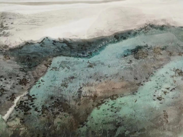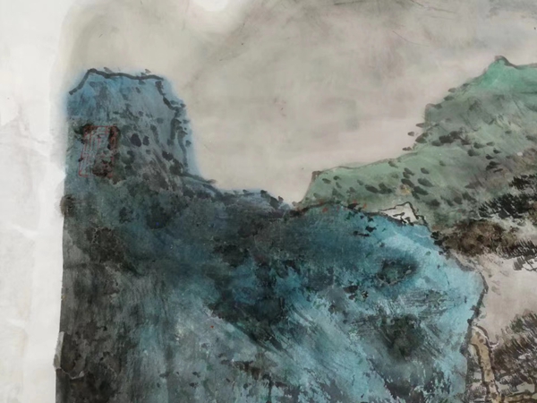 我认识了胡学东老师已经有十多年了,他平时话不多,但是对山水画研究很深,他曾经受业于中国美术学院山水画研修班,传统基础很好;他夫人是开裱画店的,修复残缺画是他夫人的专长。前几天我听朋友说,胡学东夫妇最近成功的修复了一幅尺寸比较大的名家国画,我带着好奇,来到胡学东老师的画室一看究竟,原来是老友著名山水画家乐震文老师的作品,听说这幅画原作被霉菌腐蚀得非常严重,经过精心清洗和修复以后,得到了乐老师的肯定,