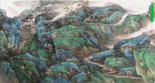 乐老师的此幅是大青绿山水,图片上可见的水墨勾、皴、擦、点是我所补画的。(上图)