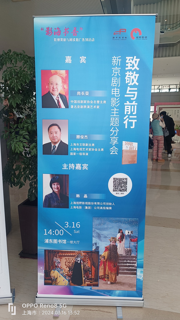 出席见面会的有中国戏剧家协会名誉主席、著名京剧表演艺术家尚长荣,上海文联副主席、上海电视艺术家协会主席、影坛名导滕俊杰,央视纪录片“超级装备”“科举”总导演韩晶女士主持,三位艺术家在浦东图书馆大厅和观众读者们“面对面”对新京剧电影分享会上进行普及与观众互动。原来,从今天起,浦东图书馆正式推出“影海书香”影视作品赏析与阅读系列活动。该活动通过引入国内外优质影视文化资源,邀请优秀影视片主创到场,与读者展开赏析和分享活动。