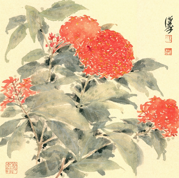 难能可贵的是,他饱览百花神采,累积不计其数的写生作品,但这次向党百年华诞献礼的作品,全部选自国内的花卉品种。笔者最近先睹了他准备展出的百幅作品,果真花团锦簇,美不胜收。特别是看到他完成第100幅作品“龙船花”时神采飞扬的快乐,真的被感动了!