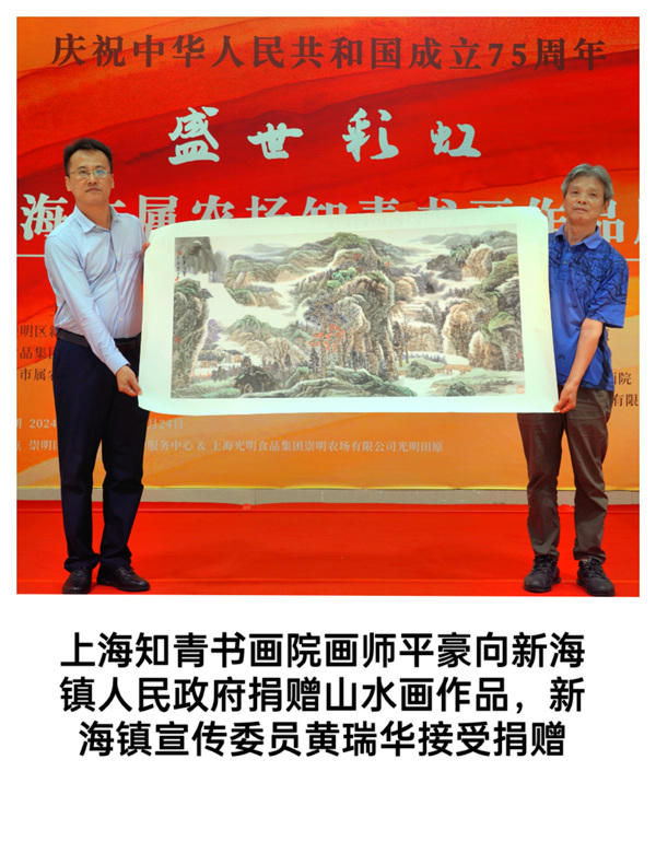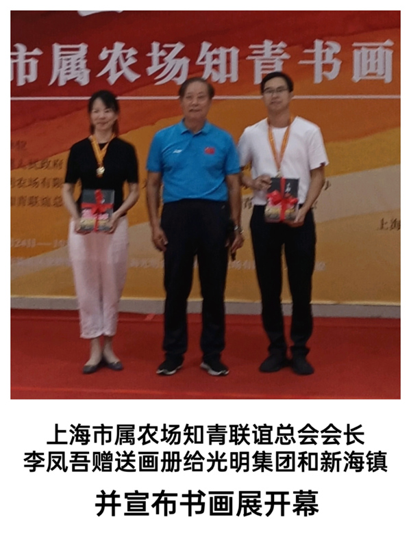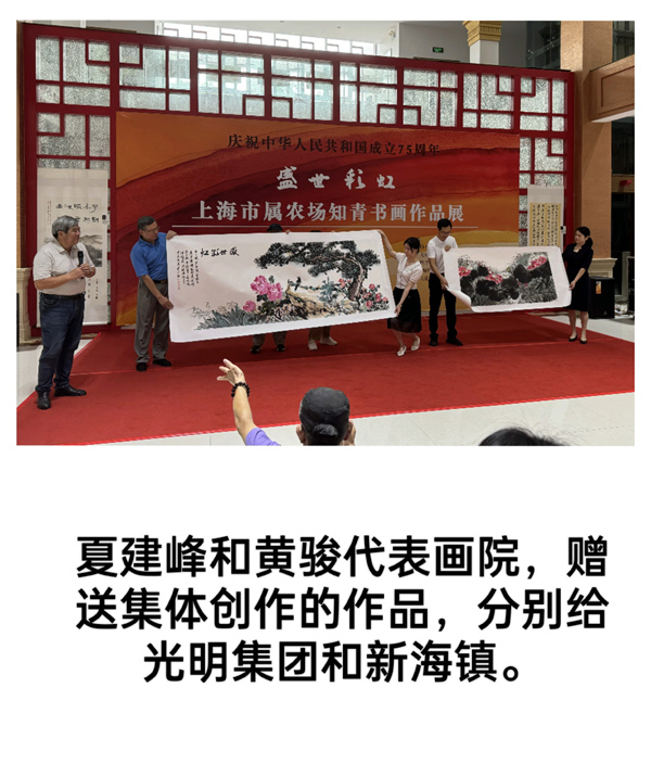 在开幕仪式上,曾经在新海农场工作过的知青、山水画家平豪老师把自己精心创作的一幅山水画作品,赠送给新海镇人民政府,新海镇宣传委员黄瑞华代表镇政府接受了作品,并为平豪老师颁发了收藏证书。新海镇副镇长季惠娟和夏建峰院长同时为“上海市属农场知青书画联谊会和上海知青书画院、新海写生创作基地”揭牌。夏建峰院长和画院总顾问黄骏老师,把画院集体创作的两幅大型作品,分别赠送给新海镇人民政府和光明集团崇明农场有限公司。上海市属农场知青联谊总会会长李凤吾,分别给新海镇和光明集团崇明公司赠送了刚刚出版的《农场知青老照片》和《老照片背后的故事》。