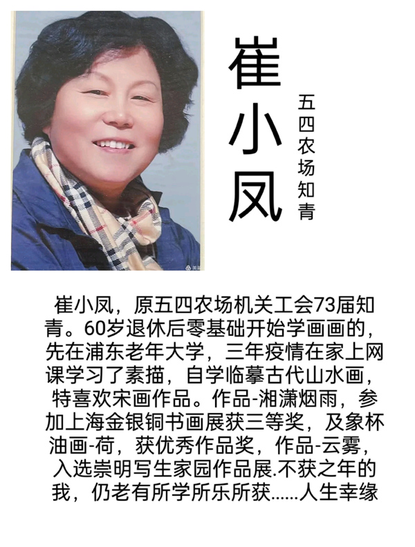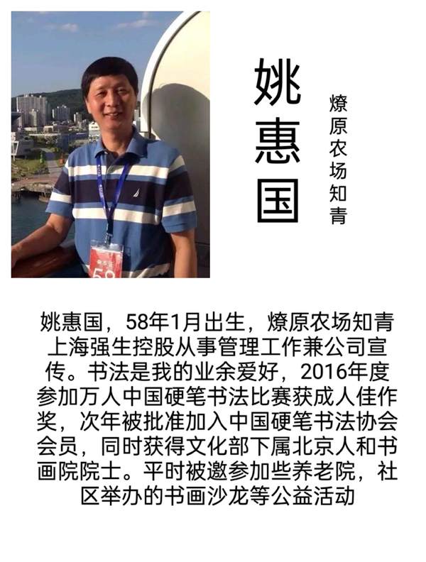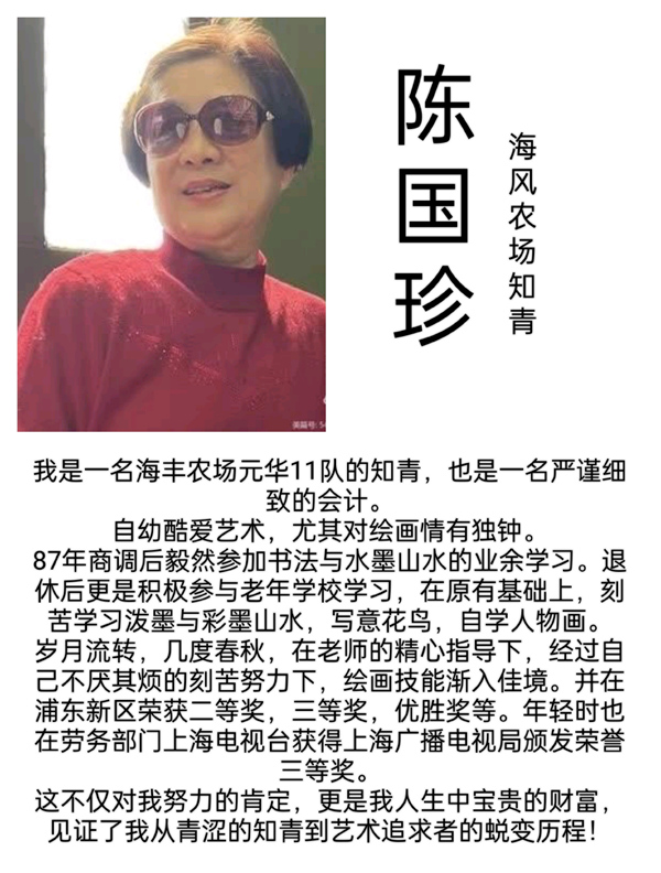 由于时代的各种原因,我们曾经在农场的知青,他们从小喜欢书画,许多都是书香门第出生,一起来到了农场,由于政策的不断变化,他们中,有的回到市区到了企事业单位,有的到部队,有的出国深造,在异国他乡生活和工作,由于各种原因,耽搁了在书画领域的发展,他们的作品照样非常精彩,尽管还没有加入省市级以上美协,现在都加入到我们上海知青书画联谊会。大家一起玩,玩的高级,玩的优秀,这次他们也拿出了精心创作的代表作,参加巡回展览。