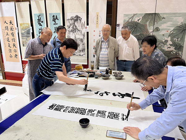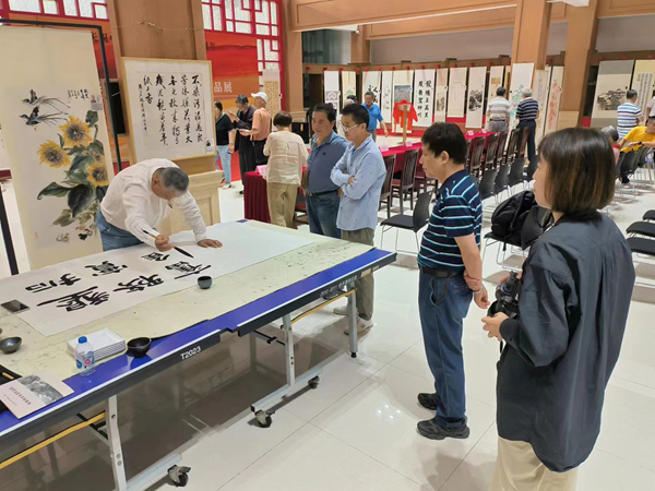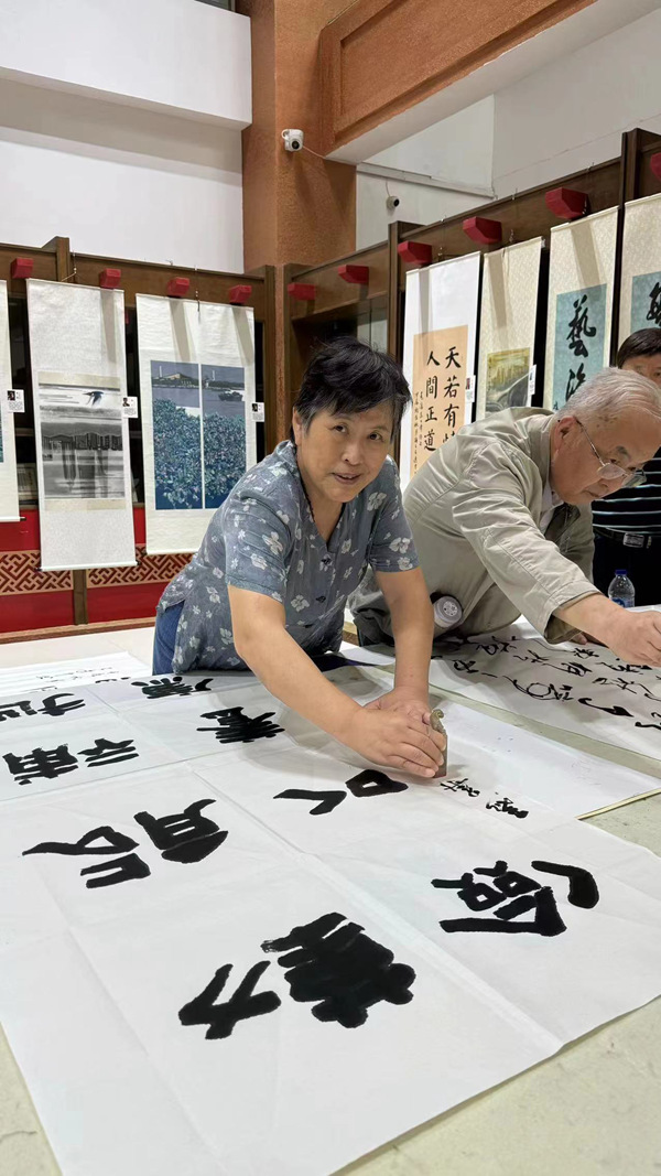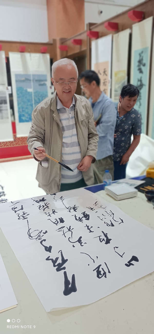 在开幕式前,中国书法家协会会员王逸中为新海镇和光明集团崇明公司分别写了两幅六尺整张的书法作品,书法家何侠斋、戴丽华、林小敏、姚惠国、王国强,画家平豪、顾鞍钢挥毫,他们创作的作品,全部捐赠给新海镇和光明集团崇明公司。现场观众和书画家之间相互交融,气氛热烈。