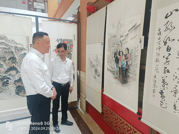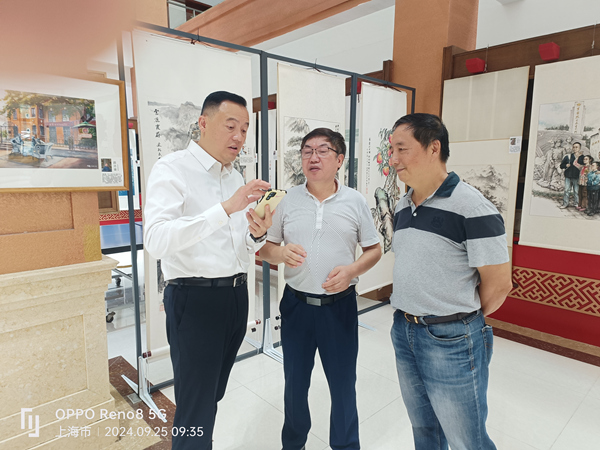 25日上午九点半,上海光明食品集团原总裁曹树民,专程从市区来到新海镇党群服务中心画展现场,看一看展览做的怎么样,曹总一边看,一边问,看的很仔细,问的很清楚,曹总是内行,对画展效果,还是满意的,在陪的有新海镇有关领导、上海市属农场知青联谊总会领导、夏建峰会长全程陪同。