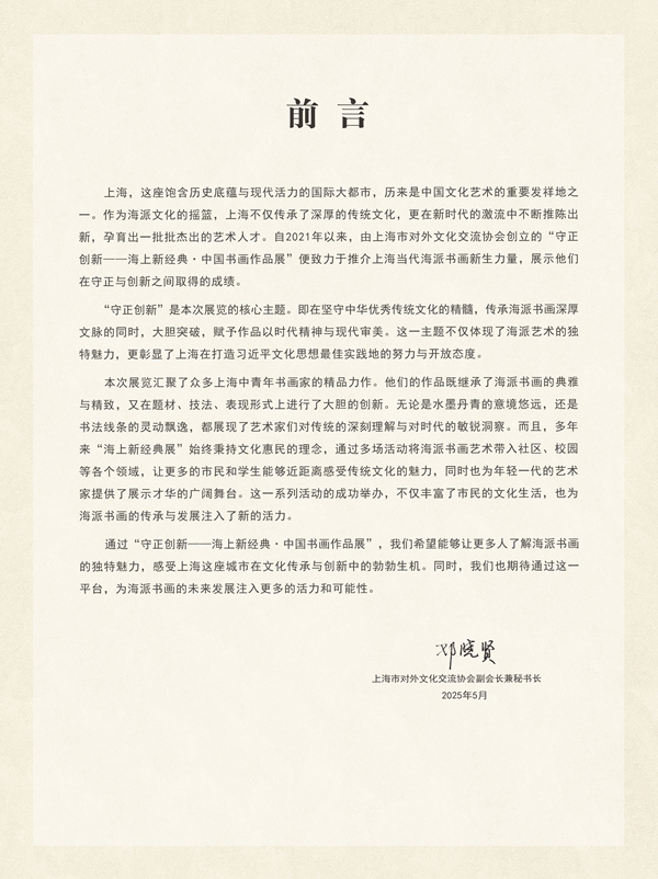 自2021年上海市对外文化交流协会创立“海上新经典·中国海派书画作品展”品牌以来,协会便致力于推介上海当代海派书画的中青年艺术家,展示他们取得的艺术成绩。而且,多年来“海上新经典展”始终秉持文化惠民的理念,通过多场活动将海派书画艺术带入社区、校园等各个领域,让更多的市民和学生能够近距离感受传统文化的魅力,同时也为年轻一代的艺术家提供了展示才华的广阔舞台。这一系列活动的成功举办,不仅丰富了市民的文化生活,也为海派书画的传承与发展注入了新的活力。