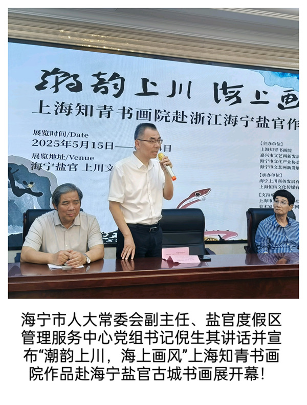 海宁市人大常委会副主任、盐官度假区管理服务中心党组书记倪生其讲话并宣布“潮韵上川,海上画风”上海知青书画院作品赴海宁盐官古城书画展开幕!