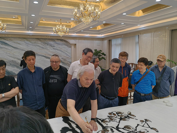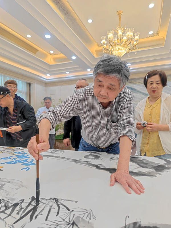 开幕式结束以后,大家移步二楼大厅,浙江书画家和上海来的书画家进行了笔会交流。陈琪老师开笔画白玉兰,余仁杰在白玉兰下面画了一个大石头,夏建峰在大石头上跟着加上几笔,陈琪老师继续在丈二匹上宣纸上左右逢源,很快一幅精彩的作品完成了。接着第二幅丈二匹作品开始创作,夏建峰院长,请余仁杰开笔,这幅作品在统一协调下,所有来参加开幕式的上海嘉宾,都动了手,使交流,达到高峰。
