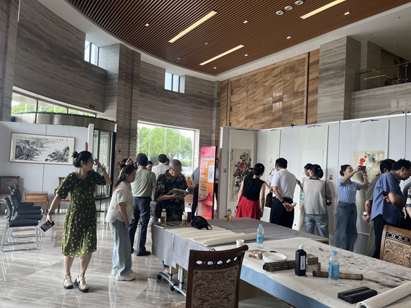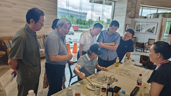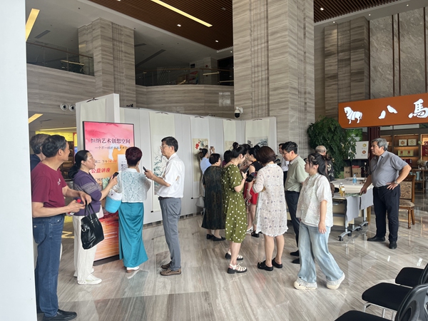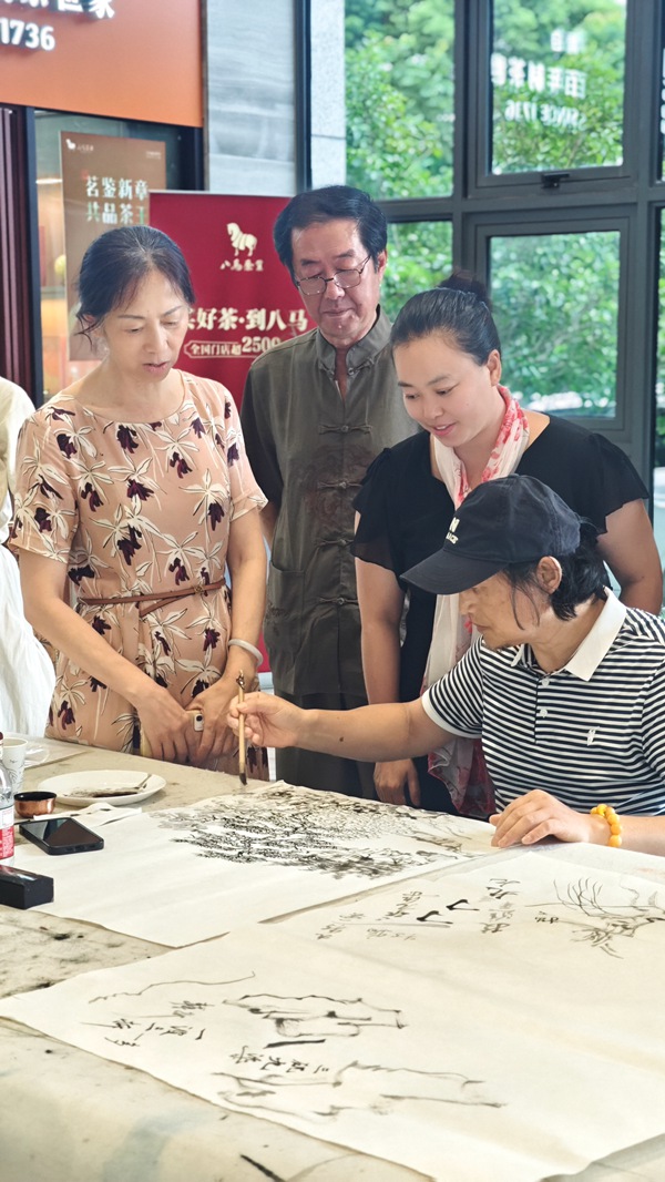 活动现场,参与者或驻足细观名家笔触,或拍照记录构图精髓,更有爱好者即兴勾稿临摹,沉浸于艺术创作之中。自由交流区内,大家围绕笔墨技法、创意表达等话题展开讨论,现场氛围热烈。胡学东还进行了现场示范,进一步拉近艺术与公众的距离。