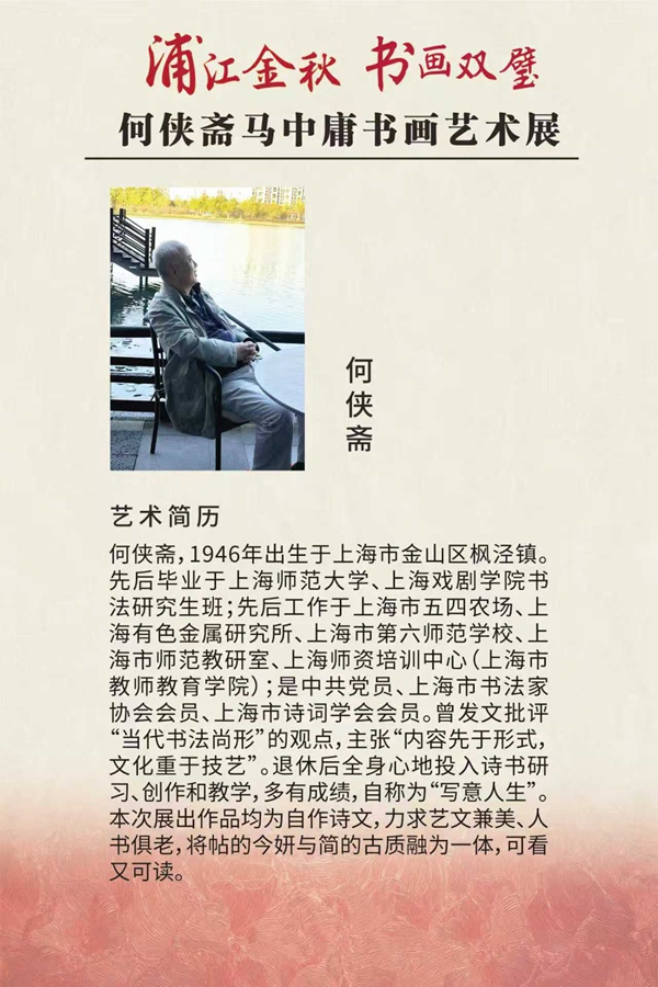 机缘巧合,与何老师结下了深厚的友谊。我们曾在一起讨论国学,讨论诗歌与绘画,并多次联合筹划“天演文化”系列活动:2015年,蓝戊己联合何侠斋先生、胡珩先生在静安新城举办的“黄埔国学堂论语讲座”暨2016年虹梅路街道古四居委《建筑移位工程》讲座;2016年,联袂举办了“不亦乐乎”文化创意活动,包括何侠斋《论语》主题书法展、刘强《论语新说》新书发布会、蓝戊己《重温论语的当代意义》讲座、何侠斋《书法艺术与论语精神》论坛等;2018年,中南大学工程77级上海建筑文化参观考察活动,期间邀请何侠斋老师为每位同学题写赠言;2019年,在枫泾古镇为何侠斋、张嘉兰、邹家樑赴澳书画作品展举办预展,本次展览是这一系列活动之五。