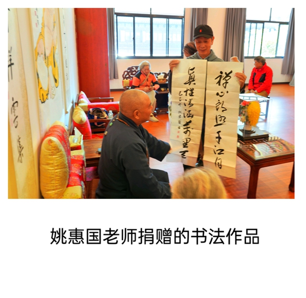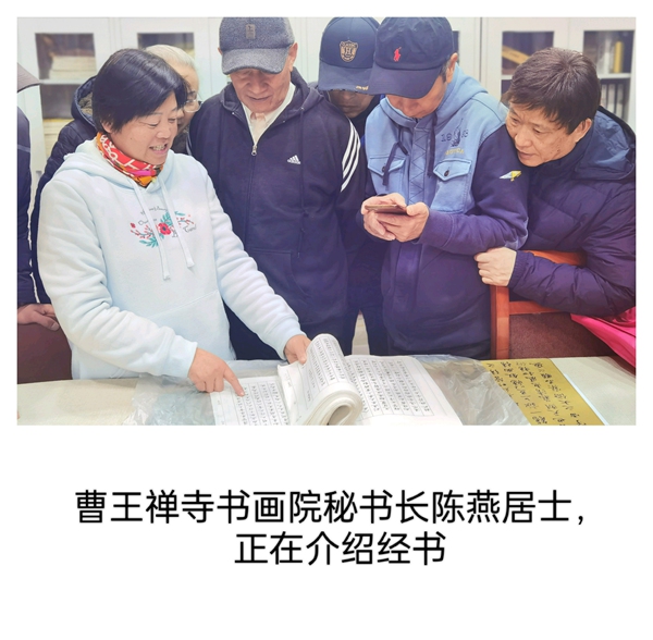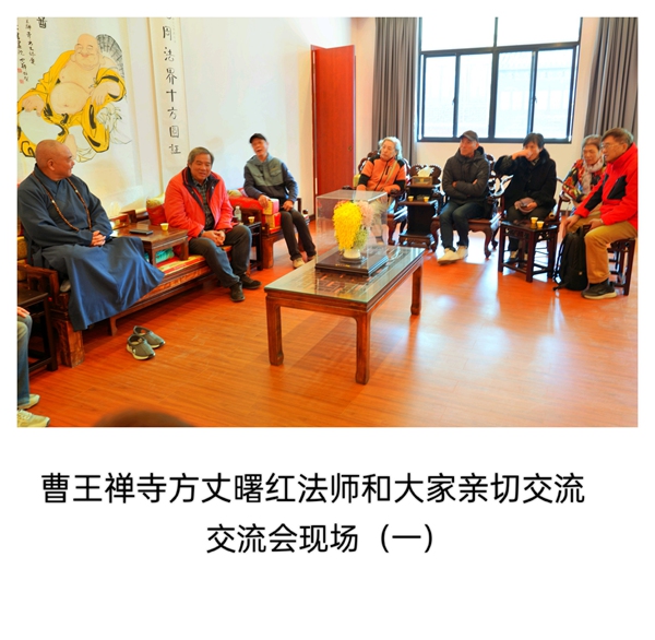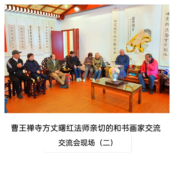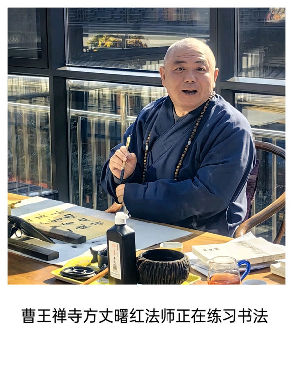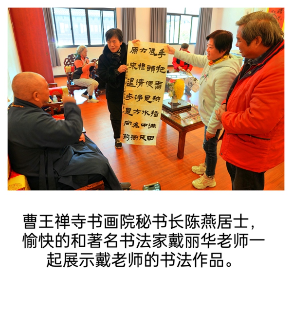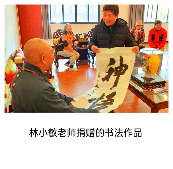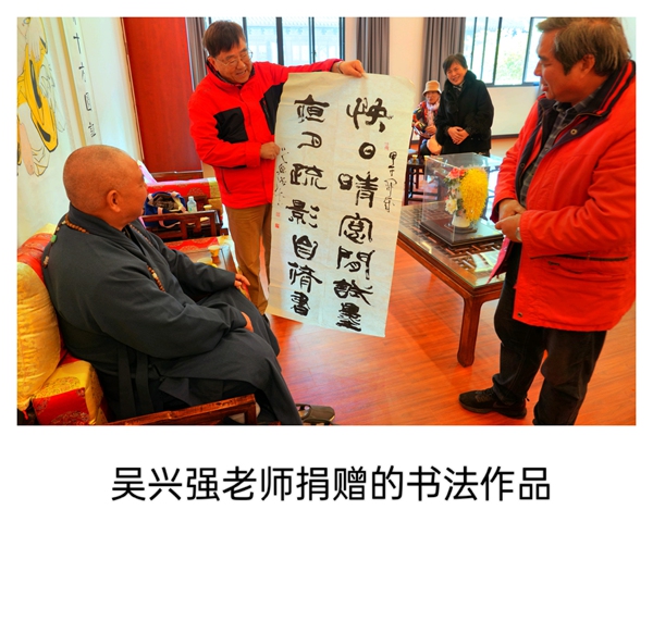 活动首站,众人拜见了正在习书的曹王禅寺方丈曙红法师。法师谦和地请大家先至客堂用茶,稍后即至。片刻之后,法师如约前来,与书画院同仁畅叙交流。曙红法师学识广博、谈吐从容,从佛法到艺术,由历史至人生,无不娓娓道来。令人感佩的是,法师不仅深谙书法、精研笔墨,更将整座寺院治理得井然有序,于一殿一阁、一草一木间,皆可见其修为与匠心。