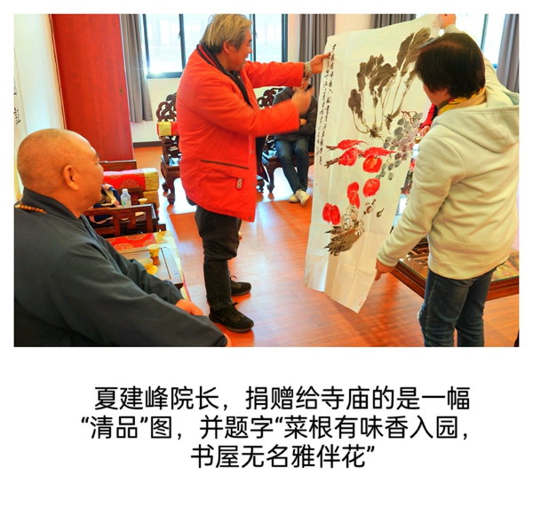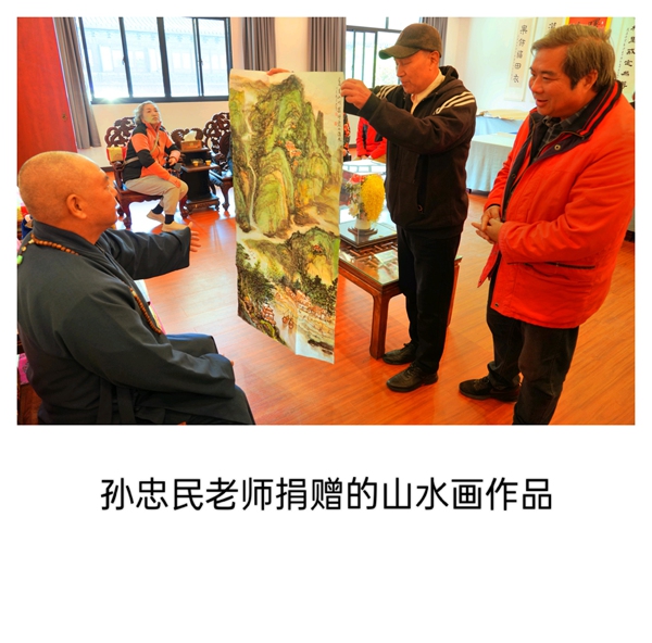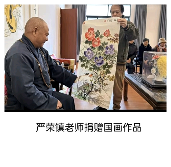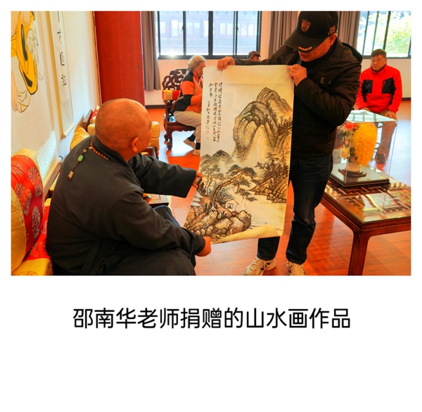 在随后的交流环节中,夏建峰院长首先展示了准备捐赠给寺院的一幅四尺整张作品。其后,书画院的艺术家们也纷纷呈现各自精心创作的代表之作。山水气象万千,花鸟生意盎然,人物形神兼备,书法笔走龙蛇——诸多佳作在古寺雅室中渐次展开,顿使满堂增色。众人围绕作品切磋交流、互相启发,艺术灵感在对话中不断激荡,现场洋溢着对传统书画艺术的诚挚热爱与执着追求。