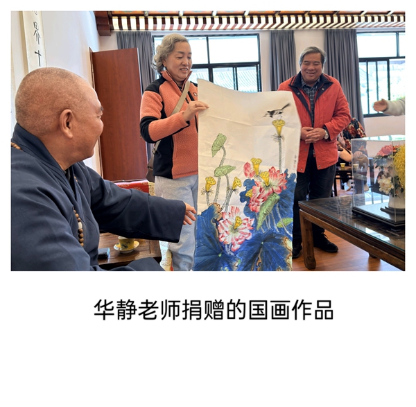 随后,在陈燕秘书长的陪同下,艺术家们漫步参观寺院园林。梵呗清音,炉香袅袅,古建与庭园相映成趣,大家在移步换景之间,静心体味禅意空间的宁静与深远。晌午时分,寺院以素斋款待,众人于饭香茶韵中继续畅叙艺事、交流心得,情谊愈深。