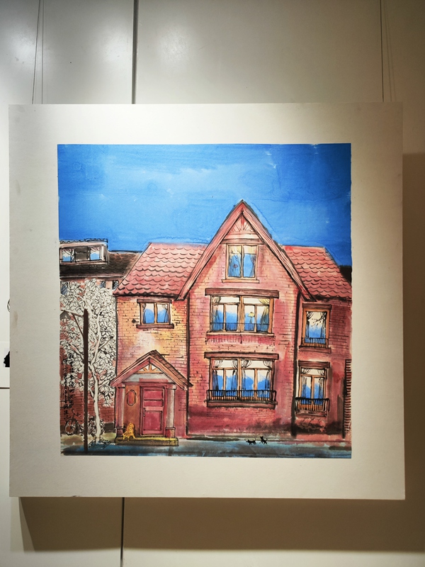本次展出的八幅作品中,一幅描绘上海理工大学老洋房的建筑画尤其引人注目。“这是为了纪念曾经年轻的自己。”王璐瑶解释道。大学第一节专业课,她就曾拿着画板在学校老洋房前写生,如今用国画技法重新呈现,既是对母校的怀念,也是对初心的回望。