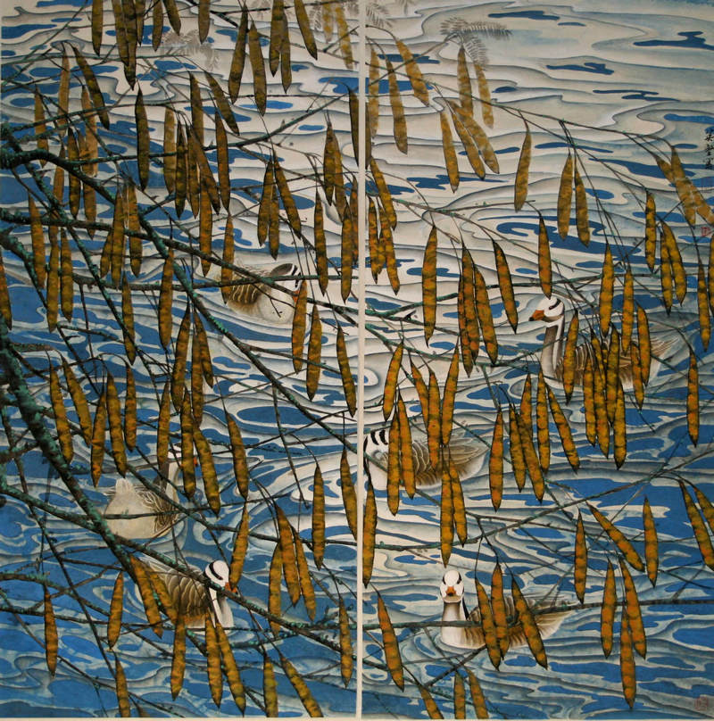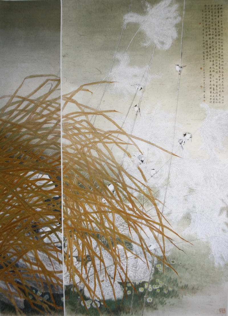 书法早年多作篆隶,偶取简牍笔意,后主攻行草;国画初学人物,后转习写意花鸟,取法任伯年。上世纪末以写意笔法入工笔,喜以纯色作重彩。近年师事方增先先生学笔墨写意。