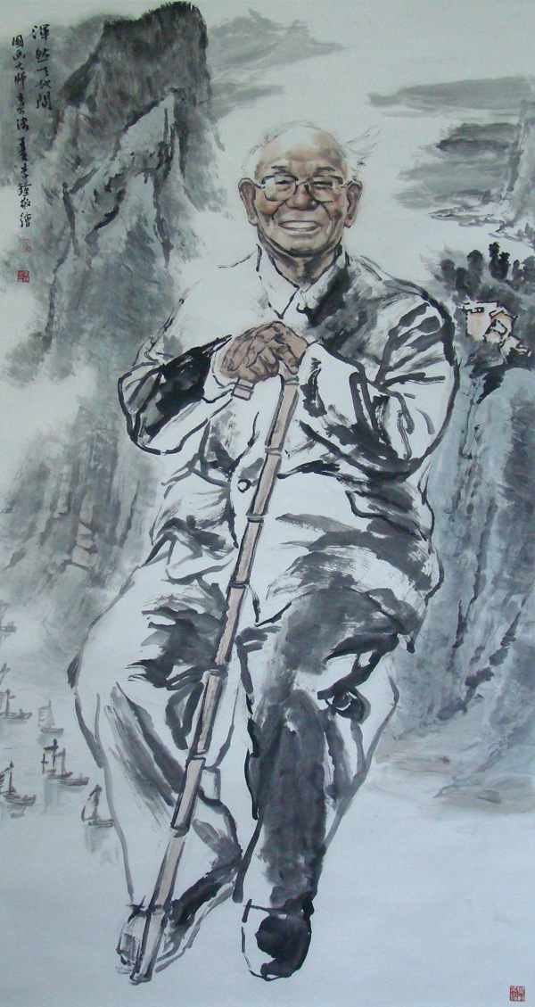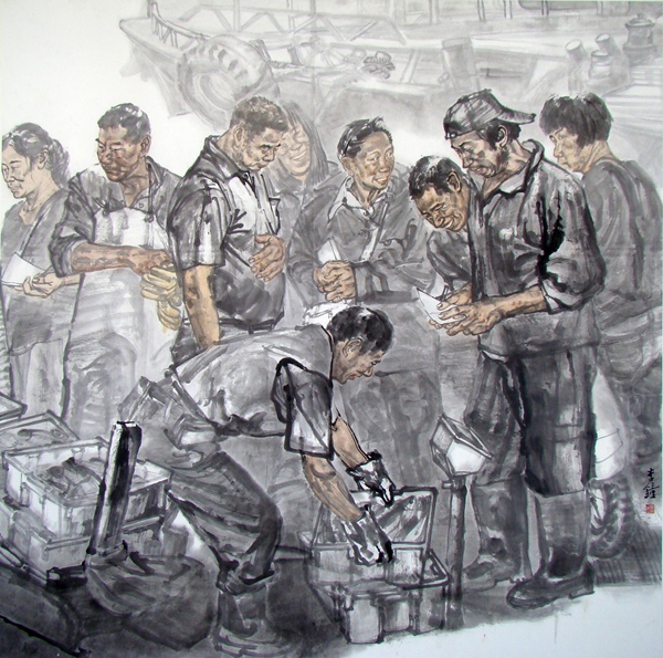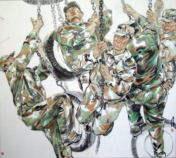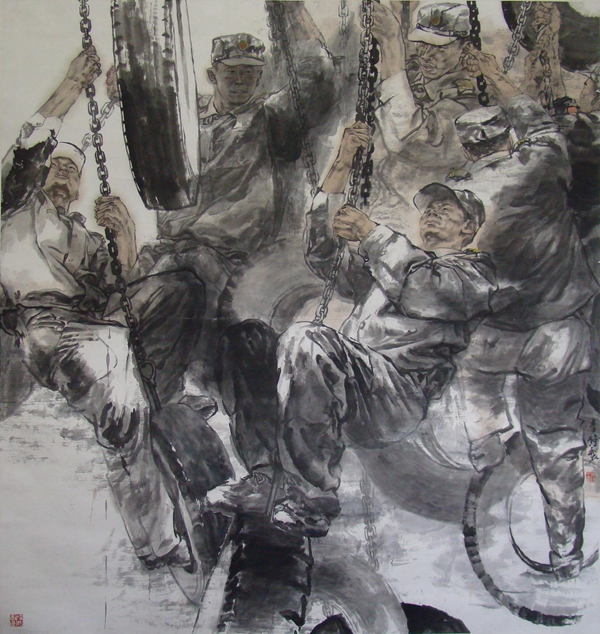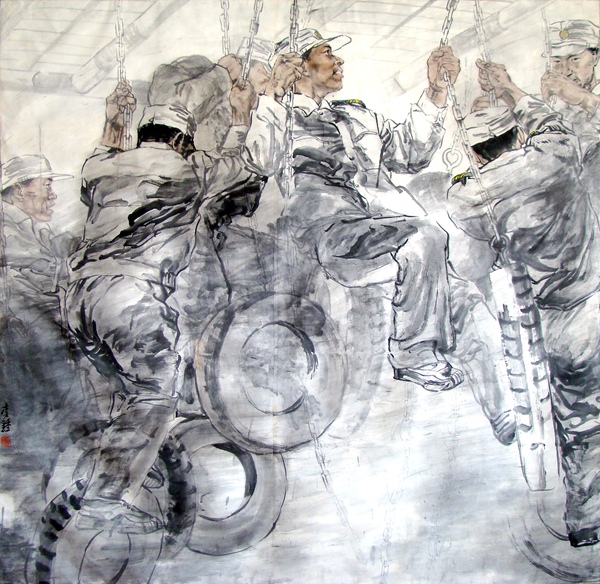 军人的历练当然也对李钟作品的风格产生了影响。他喜欢下笔直取,画面上没有多少的机巧精术,用纯粹的笔墨去直面军营生活,透露出军人的直爽刚正之气。仿佛是受到了浙派前代大家吴山明先生笔墨风格的影响,李钟把他的人物画在墨色深度上降低了一个层次。当代写实水墨人物画的风格探索中有一个趋向,就是将沉着俊逸、反复叠加的笔法整合到人物体面——尤其是人物衣纹明暗起伏转折的表达之中。这种艺术表达手段对提升画面人物的视觉冲击力有极大帮助;但如果掌握不好,会让画面显得灵气不足而生硬折滞。李钟降低墨色带来的柔和朦胧感,比较好地缓和了用笔墨在追求明暗凹凸关系上所带来的凌厉感与生硬感,意境显得更加婉约,画面更加具有水墨韵味。