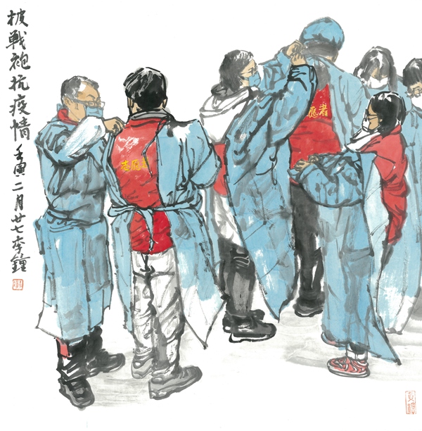 李钟《披战袍抗疫情》中国画 69×69cm 2022