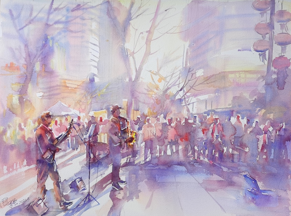 街头艺人 54×77cm 水彩