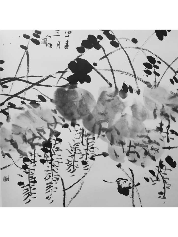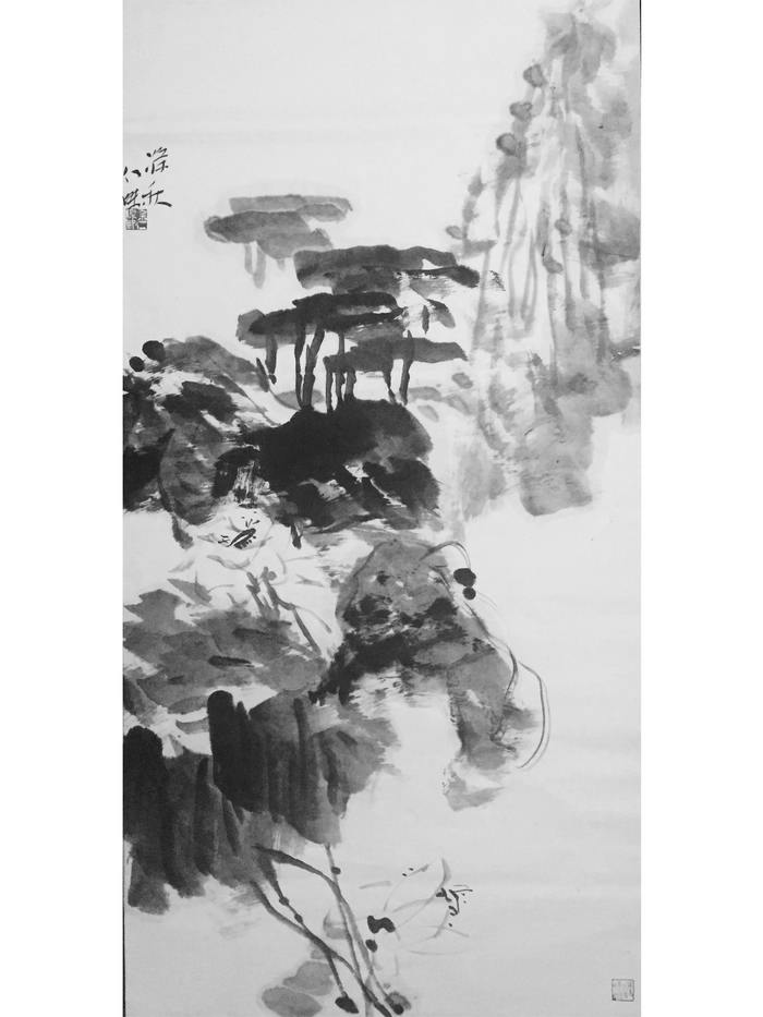 细数近代画荷名家,张大千追求荷韵,清新优美、挥洒如意;齐白石追求荷趣,天真烂漫、不似而似;潘天寿追求荷骨,霸悍顽强、峥嵘不屈;于非闇追求荷色,形象逼肖、妍丽精巧。余仁杰画荷似乎有意避开诸上名家,而独取元明之空灵悠远,徐渭、朱耷的影响尤为深刻。用卢金德的话来说,就是“余仁杰的中国画在大写的酣畅中很使画面有一种蔚霞的张力”。