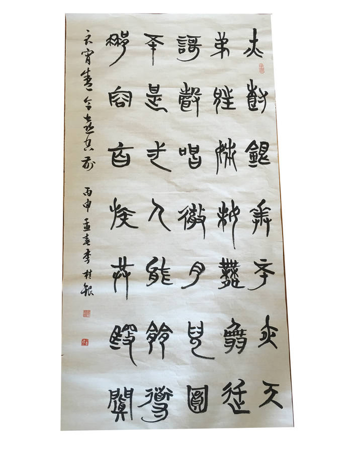 其书作严谨古朴、厚重雄健有序、委婉柔韧,寒暑无间,终年临池不辍。作品舒展流畅、雍容大度,墨缘意趣中求神韵,洒脱中求飘逸。