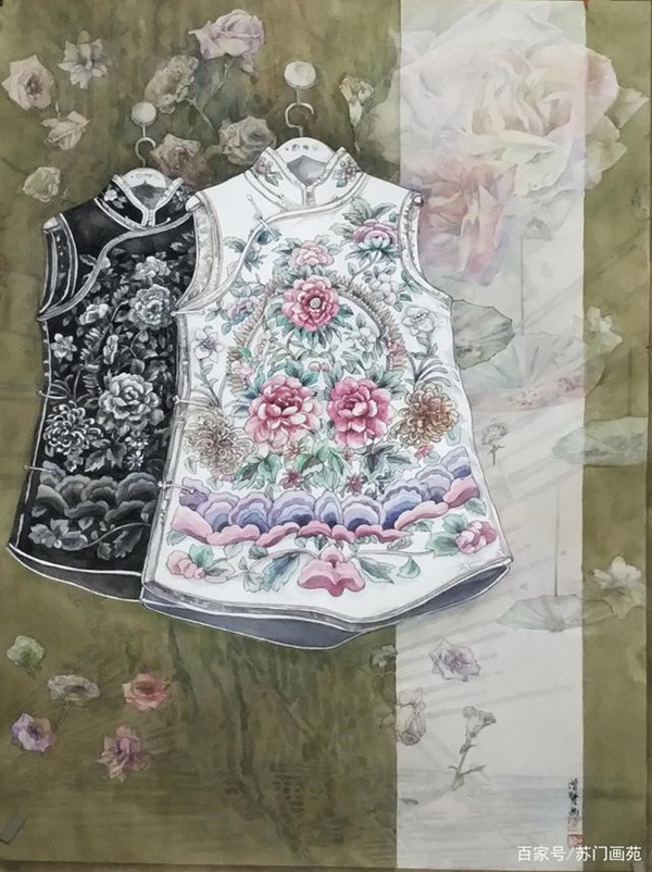 在学生引荐下,认识了卢增贤画家,虽不是很熟悉,但也曾谋面几回。从她的言谈举止中,处处透出玲珑剔透的江南女子风情。水乡的润育,江南的韵味,在卢老师身上都有显现。她水灵灵的眼神,甜滋滋的笑脸,总给人带来蜜糖罐长大的幸福感。前几天她给我发来画作,并请我为她拙文。细细观之《浪漫与复古》一股小家碧玉之感由然而起,女儿情,女儿秀,女儿心思女儿明。高高挂起的花背心衣,让人联想到闺房衣橱里的窃喜。高领衿衣裁剪搭配斑斓花朵的图案,正是女人雅淑而又充满奔放的追求。卢增贤女士借鉴西洋画的写实手法融入中国画绘画,秀出女儿爱美之情,更映印了她出自江南女儿之心境。