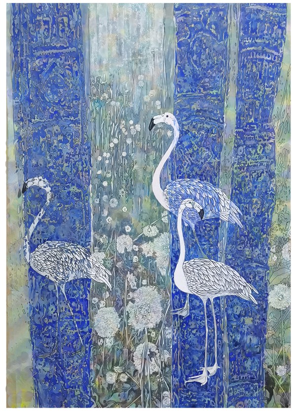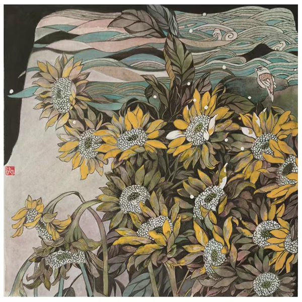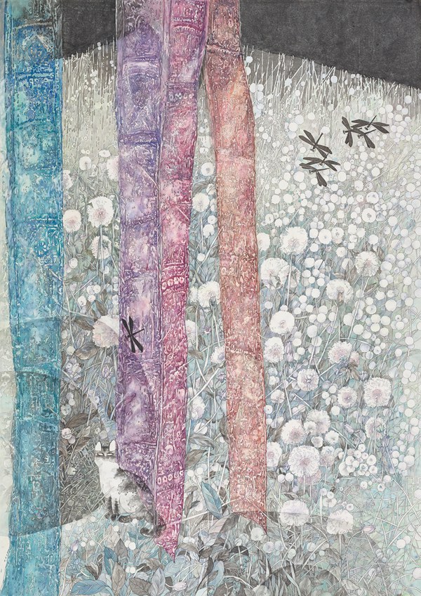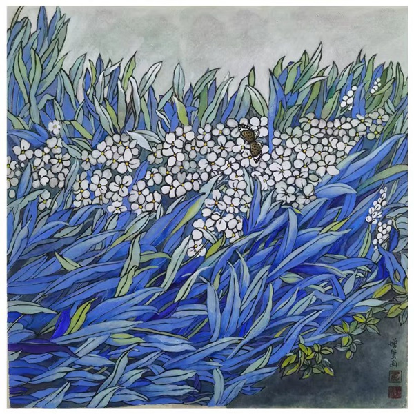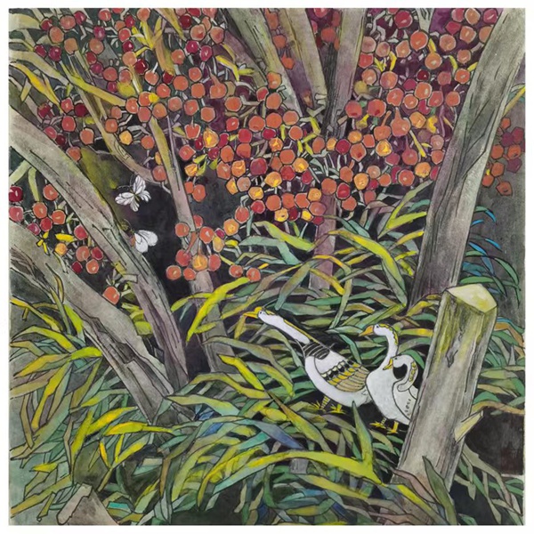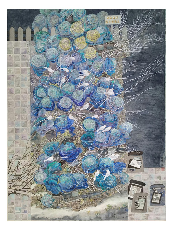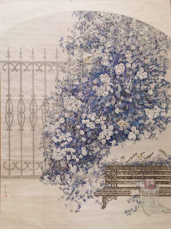 对于有西画造型功底的卢增贤来说,工笔画如《冷香的气息》《花径漫步》《寻寻觅觅》等创作也是她的强项。因为有了对笔墨线条的实践体悟,她注重勾勒物象的轮廓,那纤细精严的线条,劲健又富于弹性,饱含着生命的张力。一花一叶,飞鸟涉禽,具象又略显夸张,并依据画面的不同需要而变化,通过提炼和纯化,构成一个耸天立地、密密层层块面,成就出与传统工笔画迥然不同的现代风致。在用色上,注重大色调和小色块的搭配,使之在统一和谐中有对比与呼应,那蒲公英的淡紫,绿荫的翠碧,秋荷的金黄,野花的斑斓……情景交融、虚实相生的意境,不仅表现出画面内在的神韵,也是画家的审美追求和品味。因此,她的这类工笔画作品亮相于国展,并得到其老师,海派大家陈佩秋先生的称赞,是对她的实力充分肯定。