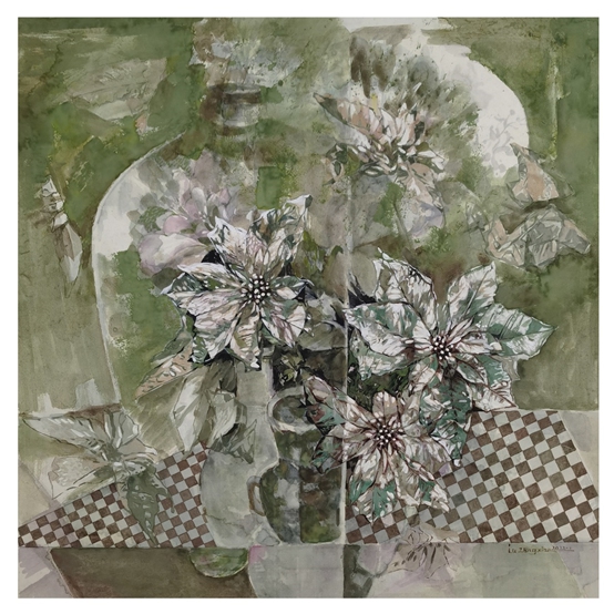 近十多年来,卢增贤以写意花卉为契入点,在创作中不断尝试加入新的理念和手法,博采众长,融汇中西,逐渐形成了独特的艺术风格。如她的《清韵》《清品》等作品,是以瓷瓶、鲜花为主题,画面线条干净利落,墨色层次分明,色彩奔放明亮。她常喜欢在瓷瓶体上画几笔山水或花卉,与瓶口上的主体鲜花,工写之间,相映成趣。同时,根据画意补上茶杯、蓝印花布、团扇等,使原本清供题材,又传递出几许悠闲的生活情调。在构图上,大开大合,多以直线勾勒和淡墨组成的块面,映衬出写意花瓶浑厚的笔致,既突显了传统写意绘画的特点,又有西方绘画的构成别趣。