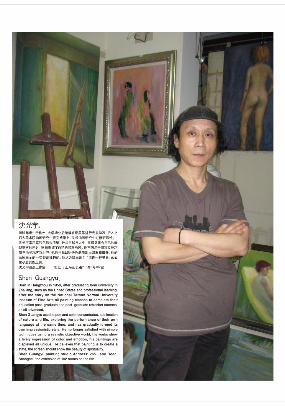 沈光宇:1956年生于杭州,大学毕业。经油画研究生进修班深造。在不断提高和积累艺术修养的过程中,形成了自己色彩独到、形式別具、流露自然、敢于创新的绘画特点和作品风格。他的部分作品已被海内外藏家喜爱、收藏,并被多家专业艺术杂志刊登。
