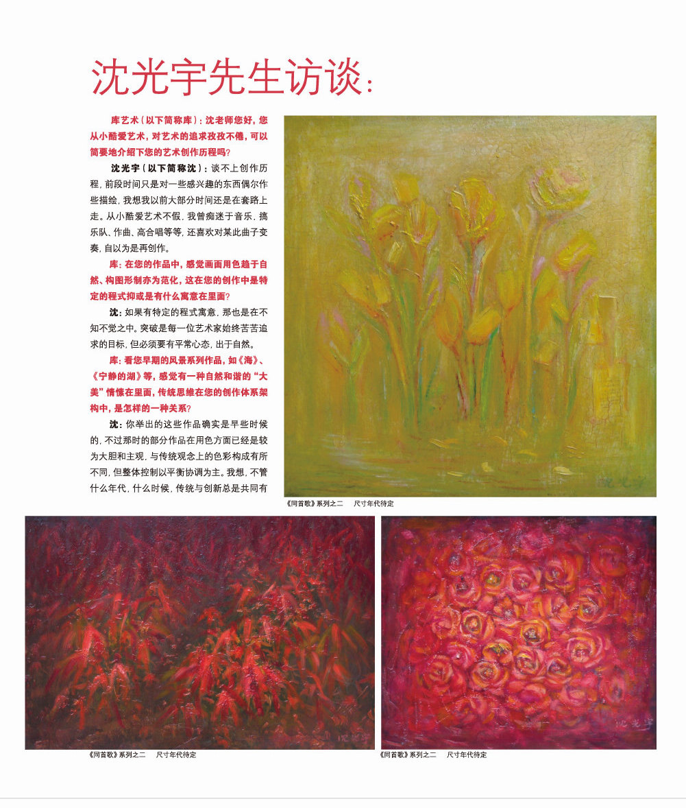 中国当代油画名家沈光宇专访:沈光宇先生认为:“创作是为了创造一种境界,我要做的就是面对今日感受,互视时空不同审美,凭着自身对事物色彩的理解,通过绘画语言,去表达、传递人们的心魂信息,让自己的作品真正成为‘艺术’——体现现实生活之感受,折射人类精神之领域,追求超越现实之境界,传递心灵深处涌动着的自然美”。