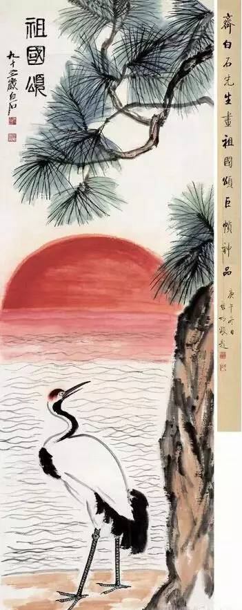《祖国颂》为白石老人1954年所作,作品将太阳,青松,仙鹤与水面四种元素安排到位,将超凡境界于简单元素的组合中传达,其企盼新中国国泰民安、人间长乐之情跃然纸上,此作有14平尺之大,可谓齐白石晚年最重要的作品。