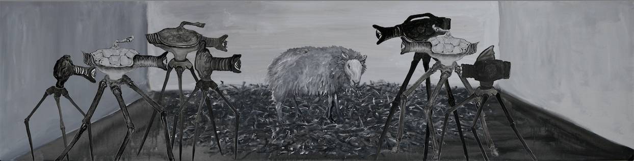 邱黯雄在中心三楼建立了一个浸入式的放映厅,其水墨动画三部曲《新山海经》首次同场出现。从2006年创作《新山海经》开始,在过去的12年里该系列动画已发展成一部深刻的移动影像志,利用先秦志怪古籍《山海经》中的神话元素与叙事结构,结合当代巨型城市景观,投射对于现代性在中国及其困境的思考,而显示出难以描述的科幻意味。《新山海经》涉猎的古典领域包括生物/动植物、地理、宗教、医学等,邱黯雄描绘的独特废墟意象不仅传达了文明更迭的夸张事实,同时与人工智能等科技成分协调,捏造了一系列描绘人类社会遭遇危机的奇观。