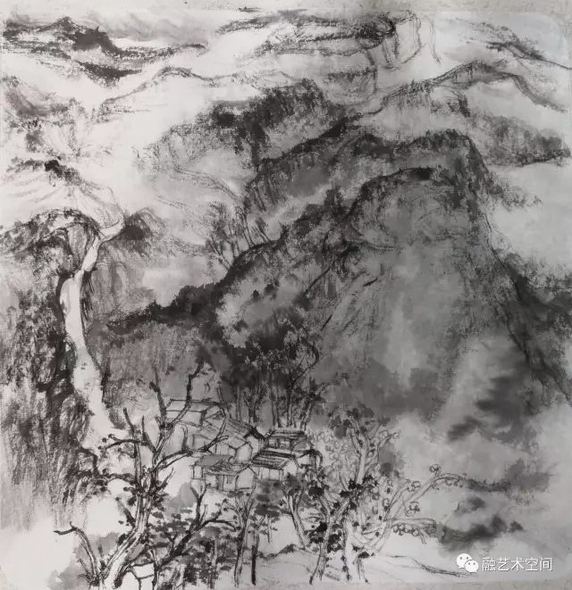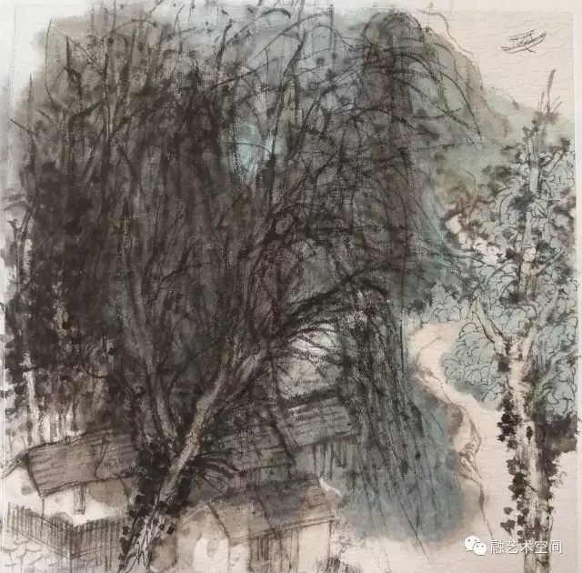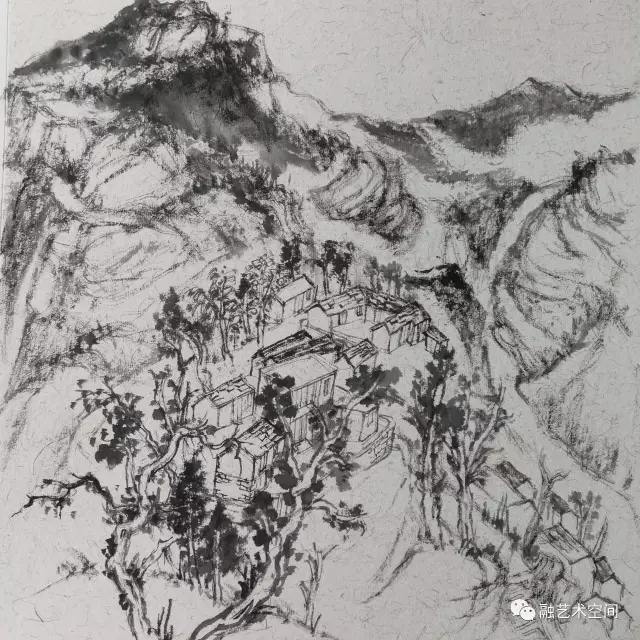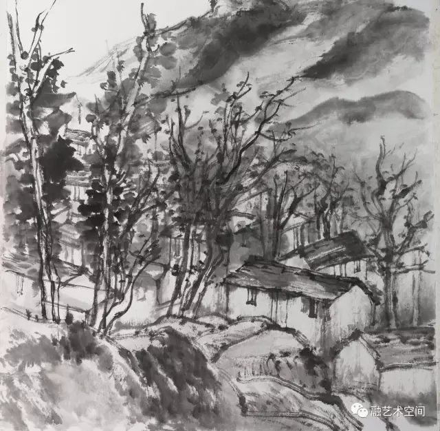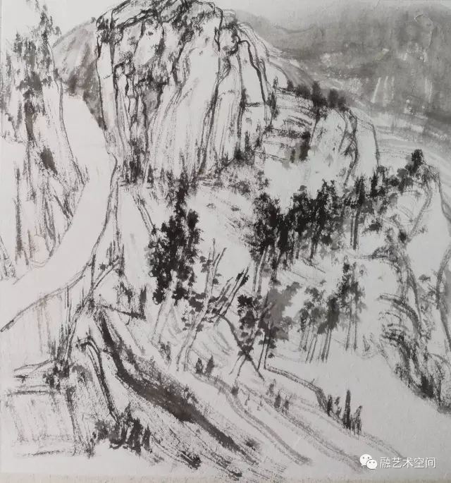 近几年来,上海美术界重创新、重生活,协会也不断组织艺术家深入生活,扎根人民,倡导坚持以人民为中心的创作导向。上大美院也很好践行师生深入生活,林矗在学校带队参与采风写生,我也常见林矗背着重达三十多斤的画箱,走进农村、山野,他的足迹走遍大江南北,太行山区深深吸引林矗的创作视线,他把太行山作为山水画创作的基地。这次展出的水墨写生大多是太行山之行的水墨写生。我读了林矗的水墨写生作品,他坚持传统笔墨的基础上,有生活味,眼前的真山真水只是他写生的形式和符号,可以随意组合挥写,为我所用,他的水墨写生作品透露出一股文人画的气质。林矗在多年艺术写生、创作中自我认识到,“写生能够体会自然的生机,理解生命之道”,他认为写生更是“连接自然”、“连接传统”、“连接自我”、“连接时代”的重要组成部分,“我们接触自然的机会比古人少得多,对自然的感情也往往不够深厚。因此今人更有写生的必要,在写生的过程中,觅古贤之迹,敬仰先贤,感悟山水之真谛”。他觉得在自然中认真观察思考,感悟自然之道,真正的自我才能浮现出来,得到释放。