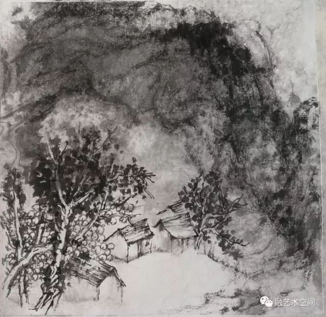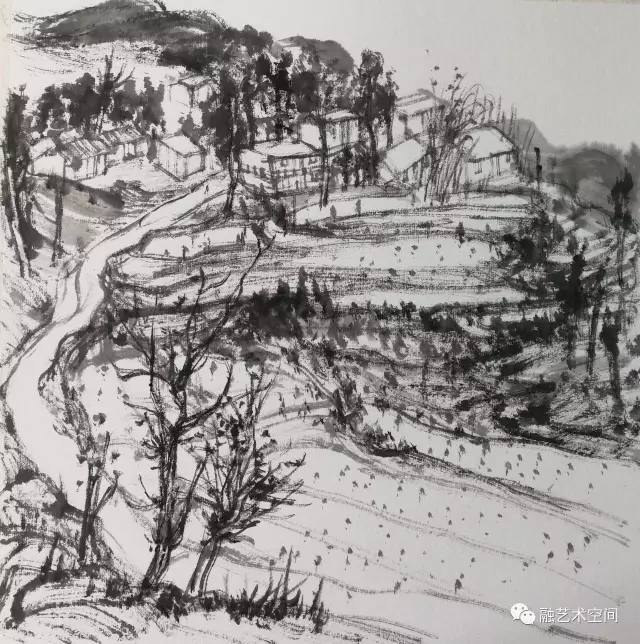他的小品每一帧都是太行山中的实地写生,以我对太行山的熟悉程度,却不太容易看出太行山的标志性形象符号,因为他本质上是借太行山在捕捉他内心的山川之美,他目中见小山水,心中念大山川。他的画面给我一种苦涩感,很难形容,是由枯笔和水墨形成的直觉感受,枯笔在纸面若有若无的游离,对形象的细节刻画是不太顾及的,他在画面中进进出出,所想表达的是画面本身的结构形式之美,而这种美因为他线条的个性使然和水墨的天然基调,隐隐约约透露着一种苦涩感,当你直面他的画面之时,我想这一点是可以感受的。苦涩是一种美,且可能是一种更高级的美,这大概是每一位成熟的欣赏者都不太敢于否定的艺术哲理吧。