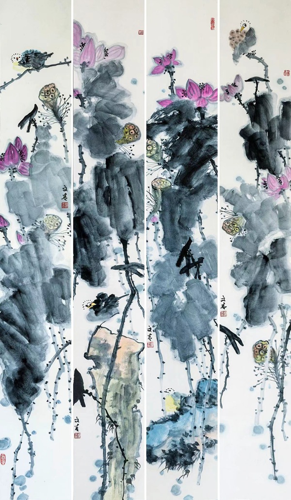 荷花 22.5×180cm×4 纸本设色
