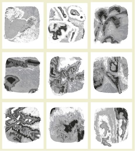 例如:我非常喜欢中国的诗歌,格律诗和词,对仗押韵的几十个字,既有音乐又有画面,是东方美学的一个典范表达,曾经创作了《涉词》系列版画作品,我选择了粉红和灰色这两种色相对比、明度却雷同的颜色,解构了自然图纹进行了创作,与我理解的诗词中对仗押韵一致,这组作品共廿余幅,是我用视觉作品表达自己对中国格律诗的理解和致敬。
