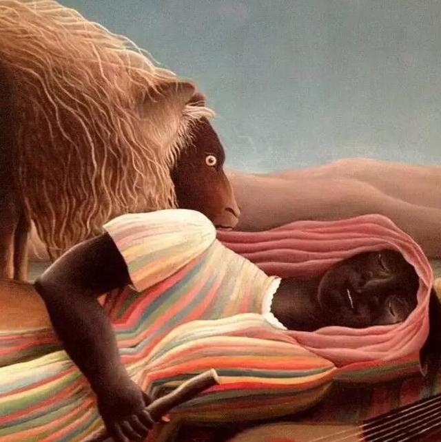 油画《入睡的吉普赛女郎》是一幅具有异国情调的作品,一位席地而睡的吉普赛人和一头雄狮在空旷冷峻的沙漠境界中格外神秘莫测,具有明显的超现实主义画风。