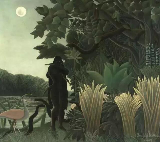这幅《诱蛇者》是画家卢梭以自然直露的率真和原始天真的想象创作的作品。诱蛇者的神话场面,犹如一种幻梦般的仙境,给人以心灵和精神上的慰藉。画面上特殊的绿调子,创造了自然的梦幻之美,诱蛇者站在浓密的林木之间,吹奏着笛子,诱引着蛇纷纷赶来。这是一幅充满神秘诗意的画面,洋溢着一种原生态之美。