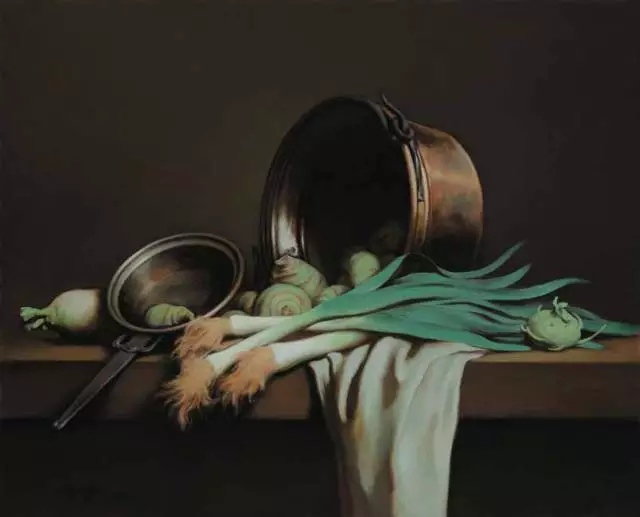 吴正恭 带有铜锅、大葱和甘蓝的静物 61×76cm 布上油画 1996年